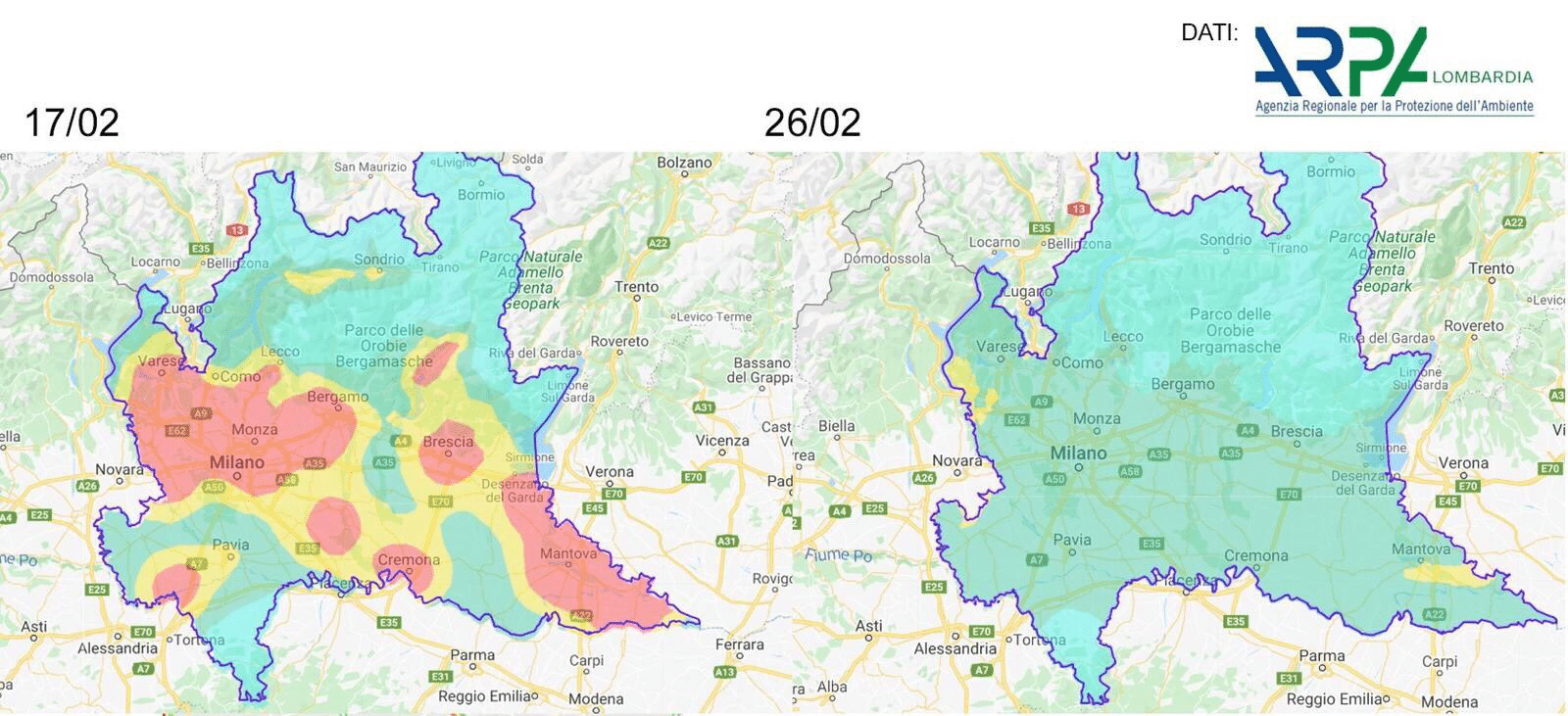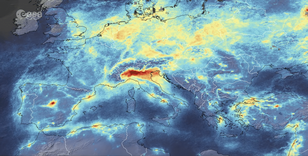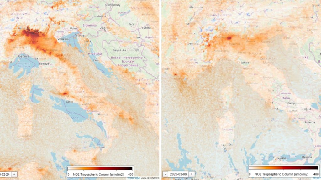 Satellite imagery has revealed a remarkable drop in NO2 pollution. Official monitoring stations in Milan mirror the picture from space (below).