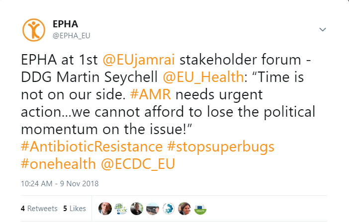 EPHA participated in the EU-JAMRAI’s first Annual Meeting and first Stakeholder’s Forum held in Vienna on 8-9 November 2018, which showcased the progress that has been made on the 9 work packages of the Joint Action to date as well as foreseen future initiatives. Moreover, through consultation with partners, work could be adjusted for the remaining duration of the project, based on recommendations received. In addition to the 4 horizontal work packages, the remaining packages address the implementation of AMR NAPs, appropriate use of antimicrobials in humans and animals, infection prevention and control, awareness-raising, and research and innovation. The ongoing work as part of the EU-JAMRAI 5th work package covering the implementation of NAPs is of particular importance. Following the mapping of NAPs and AMR strategies in several European countries, the package leaders and partners have recently embarked on a country-to-country peer review system. The country-to-country visits involve member states’ evaluations of each other’s NAPs and strategies, providing recommendations for improvement.